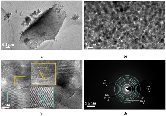 To elucidate the microstructure of nickel-doped titanium dioxide, the TEM characterization results for the 0.7% NIT sample are presented in Figure 12. Figure 12a,b reveals a spherical particle morphology with uniform size distribution, demonstrating that Ni doping retains the pristine TiO2 microstructure, a finding consistent with the SEM observations. Figure 12c displays high-resolution TEM images of TiO2 and NiO crystallites. The TiO2 lattice exhibits a d-spacing of 0.35 nm, corresponding to the (101) plane of anatase TiO2. Concurrently, the NiO phase shows a characteristic d-spacing of 0.24 nm, matching the (111) plane of cubic NiO [50]. Figure 12d presents selected-area electron diffraction patterns featuring concentric rings, where measured d-spacings of 0.35 nm and 0.18 nm correspond to the (101) and (211) planes of anatase TiO2, while 0.24 nm and 0.15 nm spacings align with the (101) and (211) planes of NiO, respectively. These TEM analyses confirm the successful Ni incorporation into the TiO2 lattice.