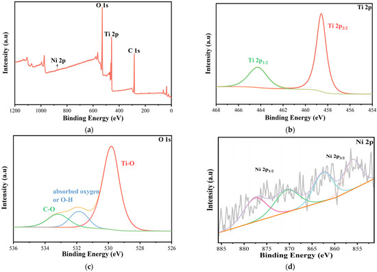 Related studies have shown that transition metal doping extends the light absorption range of TiO2 into the visible region. The 3d orbitals of transition metals enable electron excitation under visible light, while their unfilled 3d orbitals facilitate charge transfer between photogenerated electrons and holes. Additionally, the 3d orbitals of transition metals align with Ti3+ 3d orbitals, forming continuous energy levels within the conduction band [23]. Nickel, a cost-effective transition metal, has been extensively applied across multiple fields. Esfandian et al. [24] synthesized Ni-doped ZnO–TiO2 nanocomposites to investigate their electrochemical behavior and photocatalytic performance in regard to chlorpyrifos pesticide degradation. Mollavali et al. [25] enhanced the visible-light photocatalytic activity of TiO2 nanotube arrays (TNAs) via co-doping with nitrogen, nickel, and carbon. Varimalla et al. [26] demonstrated that rutile TiO2 serves as a more effective carrier for nickel than anatase. Gul et al. [27] fabricated NiO/TiO2 nanocomposites via chemical reduction, revealing its superior photocatalytic degradation efficiency and biological activity.