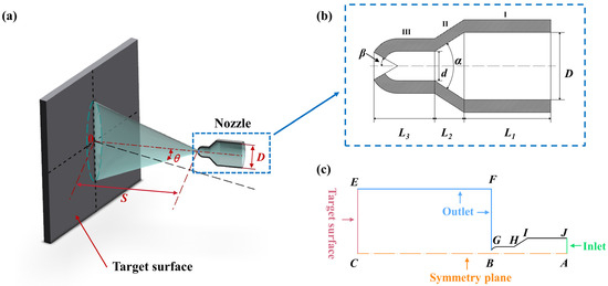 Schematic of the jet-cleaning model: (a) jet cleaning process and nozzle configuration, (b) nozzle geometry parameters, and (c) jet cleaning model boundary setting. (D: inlet section diameter; d: incident section diameter; α: shrinkage segment angle; β: V-groove half angle; θ: incident angle; S: incident target distance).