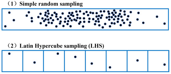 To address the inefficiency of conventional Monte Carlo (MC) methods in high-dimensional spaces, Latin Hypercube Sampling (LHS) employs a stratified sampling strategy to achieve superior spatial coverage uniformity with fewer samples. As the dimensionality increases, LHS maintains a uniform distribution across all dimensions, thereby mitigating the “curse of dimensionality” inherent to MC methods at higher dimensions [40,41,42]. As illustrated in Figure 3, significant disparities exist between simple random sampling and LHS. To ensure sampling consistency and generalizability, this study adopts LHS to alleviate computational burdens.
