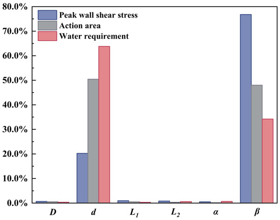 In the field of nozzle structural optimization, many scholars usually select key structural variables based on engineering experience or a local analysis [19,29], and such a parameter-selection method relying on subjective cognition may lead to the omission of important variables or the redundancy of non-essential parameters, and the empirical parameter selection is easily limited by the knowledge boundary of the researcher. Therefore, to break through the limitations of the traditional optimization methods and to obtain the optimal nozzle-cleaning performance with relatively few key structural variables, this study carried out a study on the identification of the significance of the influence of the main structural parameters of the nozzle before the optimization of the jet-cleaning performance and selected the parameters that have a significant influence on the evaluation indexes (maximum shear stress on the wall surface, action area, and water consumption) for optimization to achieve the reduction of the complexity of the related work and the improvement of the work. By selecting the parameters with a significant influence on the evaluation indexes (peak wall shear stress, action area, cleaning water consumption), the optimization is carried out to reduce the complexity of the related work and improve the efficiency. To comprehensively study the influence of nozzle structural parameters on the evaluation indexes, after relevant measurements of the nozzle structural parameters, six relatively independent structural parameters, such as the inlet section diameter D, incident section diameter d, inlet length L1, incident length L3, shrinkage segment angle α, and V-groove half-angle β are selected in this study, which are usually included in the parameters used in previous references [17,18,29].