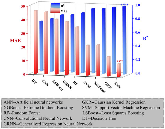 Figure 9 summarizes the R2 and MAE values for predictions generated using the nine artificial intelligence algorithms. As shown, algorithms achieving R2 > 0.90 include support vector machines (SVM), extreme gradient boosting (XGBoost), Gaussian kernel regression (GKR), and artificial neural networks (ANN). In contrast, decision trees (DT) exhibited the lowest R2 value of 0.73. Consequently, the ANN demonstrated optimal regression performance with the minimal MAE and was therefore selected in this study to predict jet-cleaning performance.