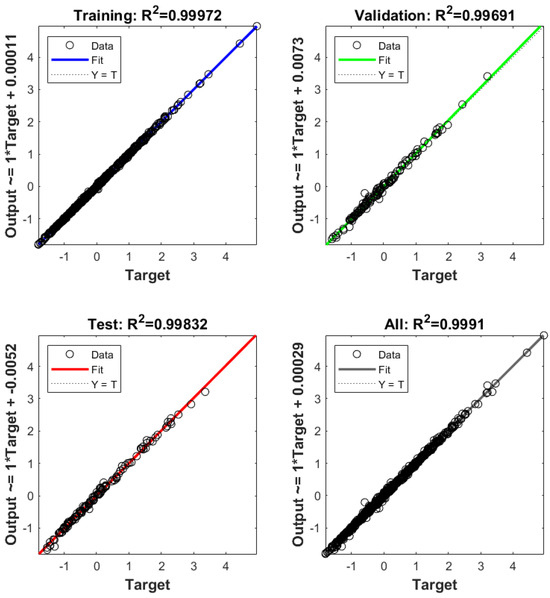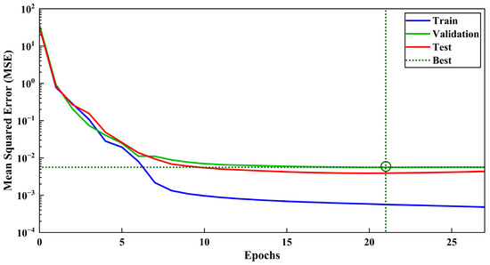 The iteration process of the artificial neural network ANN model after training is shown in Figure 10. In Figure 10, the vertical coordinate is the mean square error MSE, the horizontal coordinate is the number of iterations of the artificial neural network, the blue, green, and red curves represent the whole process of training, validation, and testing, respectively, and the green circle represents the point that satisfies the set condition after 21 iterations. As shown in Figure 11, the coefficient of determination R2 of the training set, validation set, test set, and all sets are 0.99972, 0.99691, 0.99832, and 0.9991, respectively, which are above 0.995, proving that the artificial neural network model can predict with high accuracy. This is consistent with Chen et al. [51], who demonstrated that neural networks can predict with high accuracy. Therefore, the artificial neural network model can replace the CFD numerical model, which is complicated and time-consuming in the calculation process, so as to predict the cleaning performance of aerated jets with different combinations of nozzles’ parameters relatively quickly and accurately.