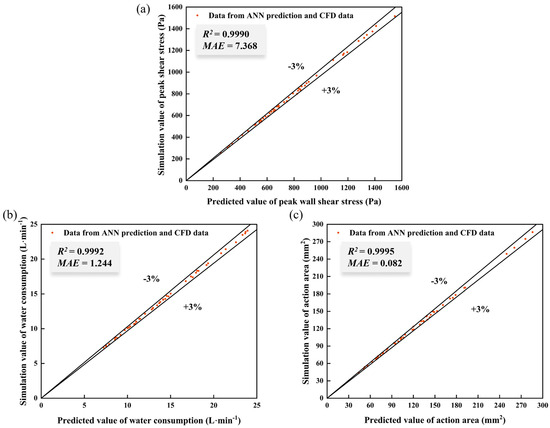 To verify the prediction ability of the artificial neural network ANN agent model on the performance indicators of aerated jet cleaning (peak wall shear stress, action area, and cleaning water consumption), this study selects a variety of parameter combinations of the aerated jet cleaning model to carry out the comparison between the artificial neural network ANN prediction and the CFD numerical simulation to validate the prediction. By systematically comparing the calculation results of the two methods, it is found that the evaluation index values of aerated jet cleaning obtained using the artificial neural network ANN agent model and CFD numerical simulation are in good agreement. Their relative errors are always lower than 3%, as shown in Figure 12, which proves that the model has a high degree of accuracy, validity, and generalization ability. The study confirms that the artificial neural network (ANN) agent model can not only accurately characterize the mapping relationship between the geometric parameters of the injector and the cleaning effect, but also has a significant computational efficiency advantage over traditional CFD numerical simulations. Based on this, the artificial neural network ANN agent model can be combined with genetic algorithms to provide a reliable basis for adaptation assessment for the optimization of the subsequent aerated jet cleaning model.