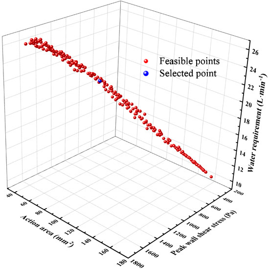Figure 13 illustrates the Pareto front solutions derived from genetic algorithm (GA) optimization, revealing inherent trade-off relationships among the optimal solution sets. As evidenced in Figure 13, the mutually constrained variables demonstrate that increases in the peak wall shear stress and water consumption correlate with a reduction in the cleaning area.