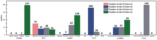 A subsequent analysis of the optimized solutions quantifies the discretization intervals for each design variable, as categorized in Figure 14. A parametric analysis revealed distinct optimal solution ratios across critical operational ranges [52]. The nozzle outlet widths range of 5.5–6.0 mm yielded the highest optimal solution ratio (98.5%), while configurations within 4.0–5.5 mm exhibited a markedly lower ratio (1.5%). For V-shaped grooving angles between 20.0° and 27.5°, the optimal solution ratio peaked at 37.5%, surpassing the 25% threshold observed in other angular intervals. Jet target distances of 17.5–20.0 mm achieved a 65% optimal solution ratio, whereas jet incidence angles of 5–10° demonstrated superior performance with 90% optimal solutions. Notably, incidence pressures within 0.35–0.4 MPa and a gas void fraction of 7.5–11.2% attained optimal solution ratios of 49.5% and 99.5%, respectively. Under these constrained boundaries, the objective functions—the peak wall shear stress (951.08 Pa), action area (70.14 mm2), and water consumption (20.80 L/min)—simultaneously reached their optima. The derived parameter combination included the following: d = 5.83 mm, α = 38.36°, s = 17.55 mm, θ = 8.68°, p = 0.29 MPa, and r = 8.91%.