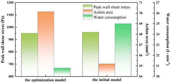 A comparative analysis between the optimized model and the baseline configuration was conducted [53] for three response metrics—the peak wall shear stress, action area, and water consumption—as illustrated in Figure 15. The optimized model demonstrated a reduction of 1.34% in the peak wall shear stress and 16.82% in water consumption relative to the baseline, whereas the cleaning area increased by 7.6%. This mutually dependent variation among the three metrics aligns with the trends observed in Figure 13. The optimization framework thus effectively enhances the jet-cleaning performance by simultaneously improving critical operational parameters.