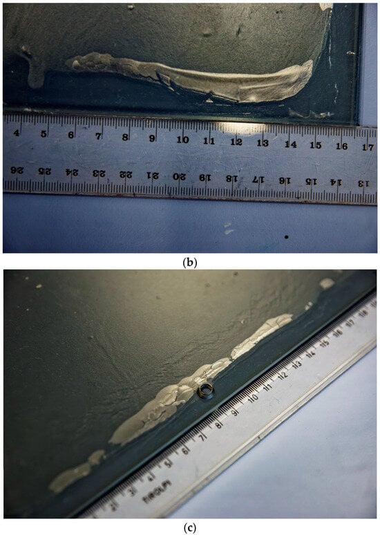 Copper substrates exhibited the strongest adhesion to the cast potato starch films. The adhesive forces exceeded the cohesive forces within the film, resulting in film rupture during attempts to detach it from the copper surface. As a result, obtaining an intact film sheet for static tensile testing was impossible. The morphology of the cast material and the observed natural detachments are depicted in Figure 3.