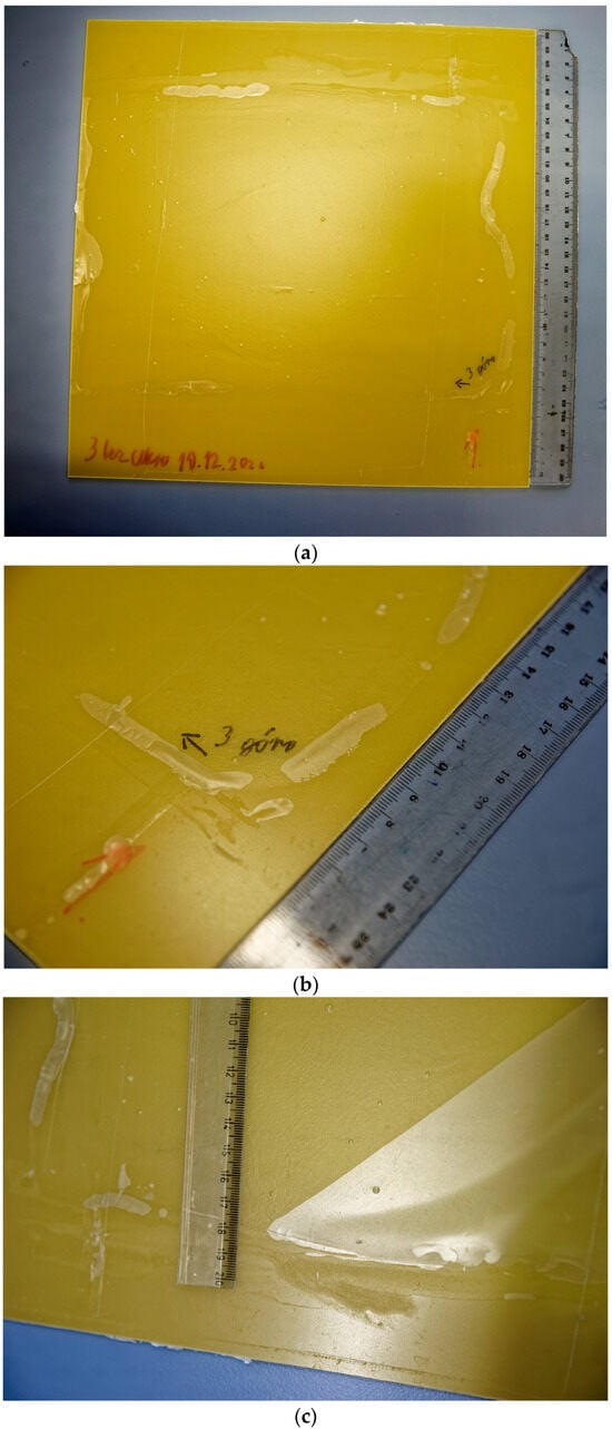 Photographs showing all of the poured films on the surface of the copper-free laminate (a), the areas where natural peeling from the surface occurred (b), and the partially peeled film (c).