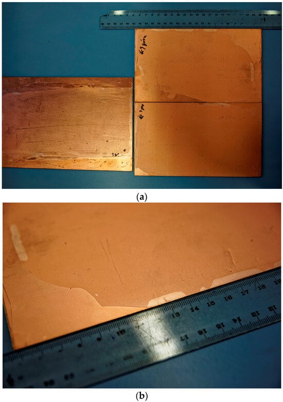 The copper plates (a) on which the film was poured are shown, as well as the areas where the foil was observed to naturally detach from the substrate (b).