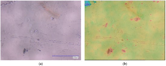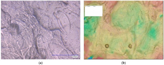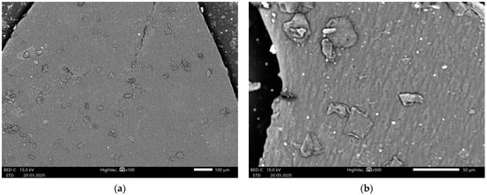 Microscopic imaging did not indicate a substrate-dependent morphology of the top film layer, as expected. However, the bottom layer exhibited substantial variations. Glass yielded a nearly transparent surface with minimal irregularities. Laminate displayed a more ordered bottom surface compared to the top, albeit without discernible patterns or structures. The films cast on copper exhibited micro-striations, potentially accounting for their enhanced adhesion. The films cast on Teflon replicated the substrate’s surface imperfections. This suggests the potential for controlled microstructuring techniques using Teflon®-based templates, which could be useful in specialized optical or electronic applications. The cross-sectional analysis of the film cast on Teflon® (Figure 9) revealed a reticulated structure, reminiscent of leaf venation, which is particularly discernible at higher magnification (b). A wider field of view (a) reveals discontinuities along the edge, likely due to fragment detachment during sectioning. We hypothesize that this structure is a consequence of the desiccation process, which is more stochastic on Teflon due to diminished surface adhesion. These findings are of significant interest.