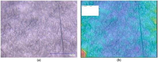 Microscopic images of the top layer of the film obtained on a glass surface at 1000× magnification (a) and an elevation map (b), red indicates the highest points, blue the lowest.