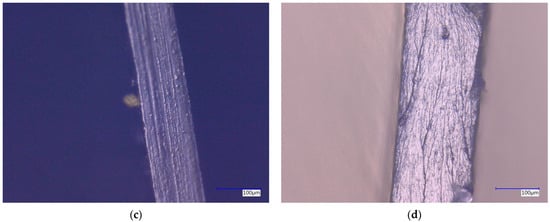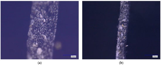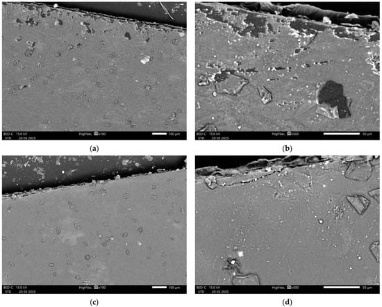 The surface morphologies of the samples were examined using a Keyence VHX-950F digital optical microscope equipped with a VH-Z100R zoom lens (100–1000× magnification) (Keyence Corp., Itasca, IL, USA). In addition to acquiring standard micrographs of the sample surfaces, three-dimensional surface topography reconstruction was performed. This was achieved by capturing a series of images at varying focal planes, enabling the determination of surface roughness. Photographs of cross-sections of the samples were also taken. The material was sectioned using a punch and press.