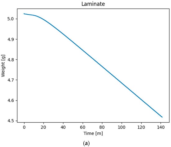 The water vapor transmission rate (WVTR) of the films was determined, as it is a critical parameter for packaging applications. WVTR measurements were conducted using a Radwag MA 210.R moisture analyzer (Radwag, Radom, Poland) equipped with a dedicated WVTR vessel. Circular film samples with a diameter of 54 ± 2 mm were prepared. Each sample was placed on an aluminum-sealed vessel containing 5 g of distilled water and then inserted into the analyzer’s test chamber. The chamber temperature was maintained at 40 °C, while the ambient conditions were kept at 23 ± 0.5 °C and 50 ± 1% relative humidity (RH).