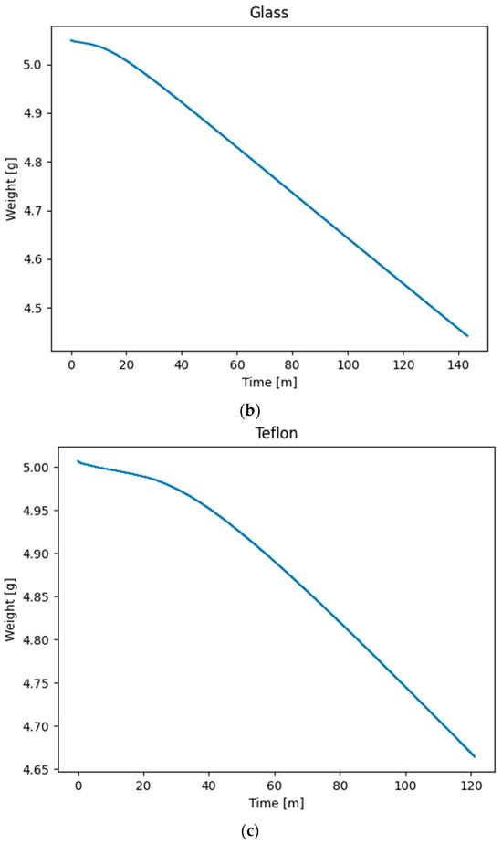During the casting process, Teflon exhibited distinct behavior compared to the other materials. The application of the hot solution (50–60 °C) induced significant thermal shrinkage, leading to challenges in achieving a uniform material distribution. In contrast, all the other materials tested exhibited no noticeable reactions or dimensional changes under the same conditions.