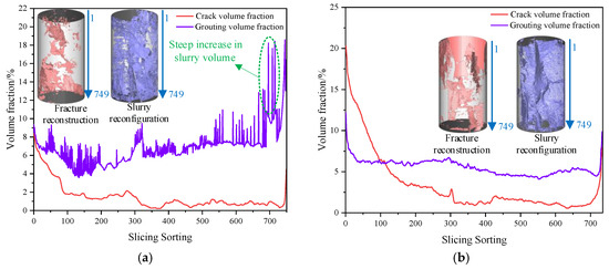 - The three-dimensional CT scanning and reconstruction results indicate that when the enhancer content is low, the edge regions of the fractured limestone specimens exhibit a higher volume fraction of fractures and a lower volume fraction of the grout matrix. However, the overall volume fraction of the grout matrix is greater than that of the fractures. When the enhancer content is high, the grout matrix is mainly distributed in the fractures at the edges of the specimens. At the same time, the internal regions have a lower volume fraction of the grout matrix. In this case, the volume fraction of the grout matrix is significantly smaller than that of the fractures. When the mass fraction of the enhancer is 15.00 wt.%, the volume fraction of the grout matrix inside the specimen reaches its maximum (13.91%), with the volume fraction of fractures being only 0.66%.