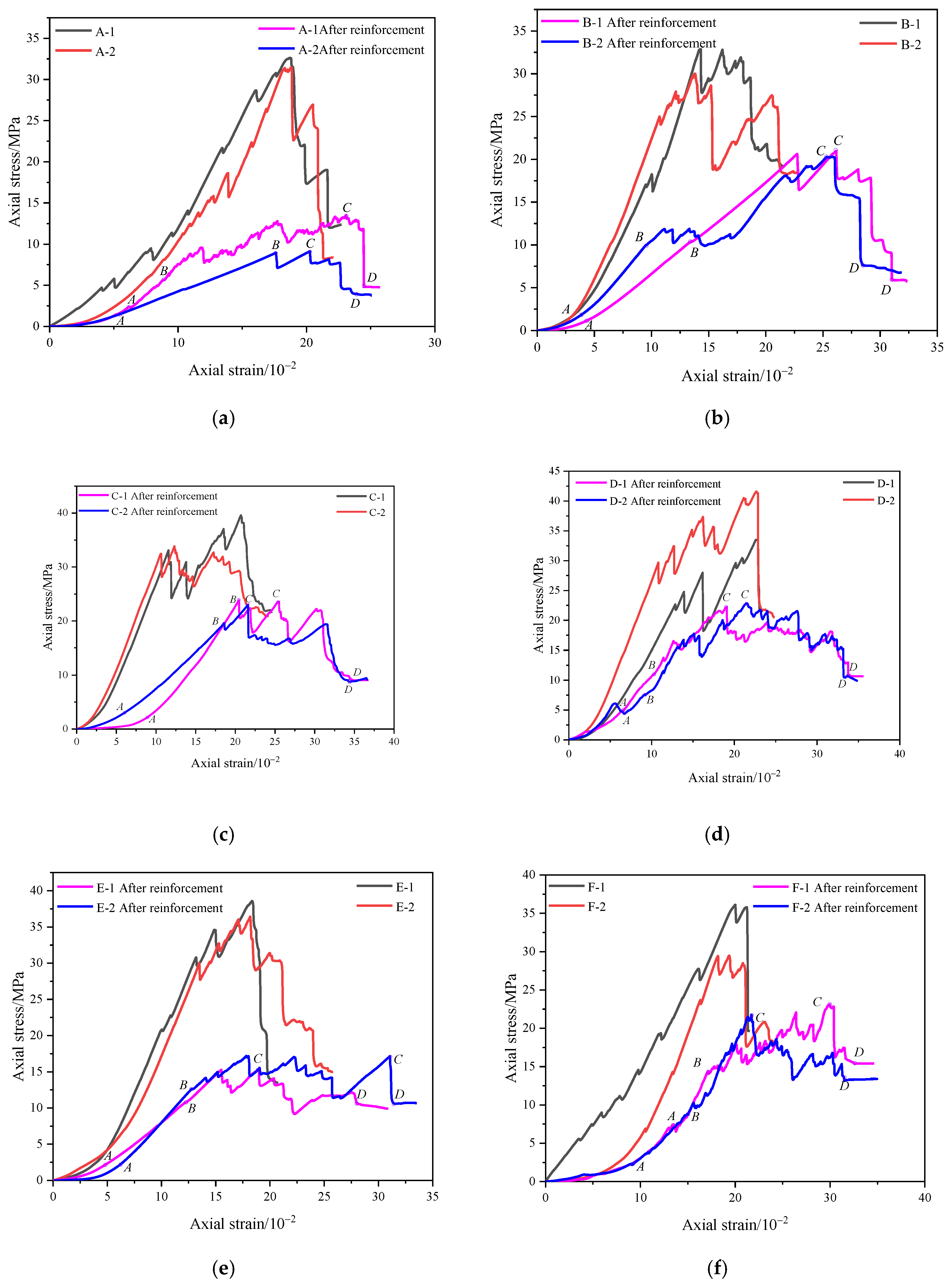 3.1. Stress–Strain Curves and Post-Peak Characteristics of Specimens