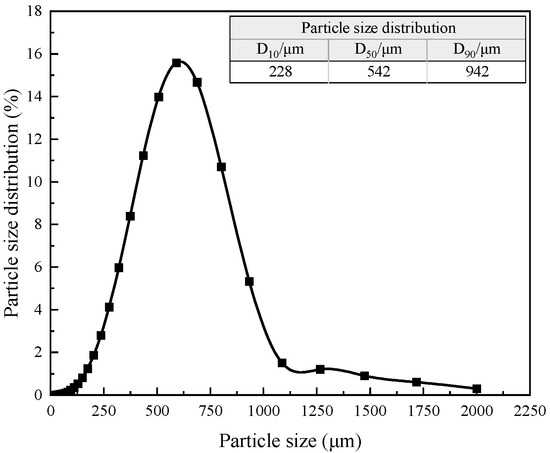 Degassed heavy oil from Shengli Oilfield was used as the oil phase, with a viscosity of 446 mPa·s and a density of 0.962 g·cm−3 at 70 °C. The oil used in the microscopic visual flooding experiment was a synthetic oil prepared by mixing the degassed heavy oil and kerosene, with a viscosity of 363.73 mPa·s at 30 °C. The mass ratio of heavy oil to kerosene is 10:1. The oil with different viscosities used in the sand-flooding experiment is a synthetic oil prepared by mixing degassed heavy oil and kerosene at 70 °C. This synthetic oil can better simulate the flooding process under real reservoir conditions. The experiment also featured a surfactant system Alkyl Polyglucoside and Linear Alkylbenzene Sulfonate Sodium Salt (APG1214/LAS-30, produced by Shandong Yousuo Chemical Technology Co., Ltd., Linxi, China) with excellent viscosity-reducing ability with an IFT of 0.15 mN·m−1 [18]. Branched-preformed particle gel (B-PPG) was provided by Shengli Oilfield. The size distribution of B-PPG is shown in Figure 1. Polymer (partially hydrolyzed polyacrylamide, HPAM) with a molecular weight of 30 million was provided by Shengli Oilfield. The brine adopted the composition of that from Gudong, Shengli Oilfield. The synthetic formation brine contained Ca2+ (292 mg/L), Mg2+ (65 mg/L), Na+(K+) (3667 mg/L), and Cl− (6583 mg/L). The B-PPG concentration used in the experiment was 1500 mg·L−1, the polymer concentration was 2000 mg·L−1, and the micro dynamic viscosity reducer concentration was 3000 mg·L−1.
