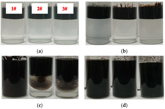 Emulsification state of heavy oil and different composite systems under different oscillation frequencies (1# is a viscosity reducer/B-PPG system, 2# is a viscosity reducer/polymer system, and 3# is the B-PPG/SP composite system). (a) Initial state (b) oscillation frequencies of 100 r·min−1 (c) oscillation frequencies of 150 r·min−1, and (d) oscillation frequencies of 180 r·min−1.