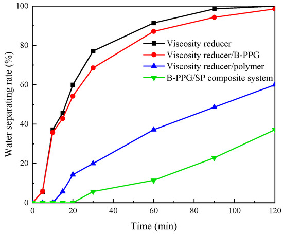 As shown in Figure 4, the emulsion formed by the B-PPG/SP composite system and heavy oil had the best emulsification stability, followed by the viscosity reducer/polymer system. This was attributed to the increase in solution viscosity, which made it more difficult for oil droplets to aggregate, resulting in the emulsion having better stability.