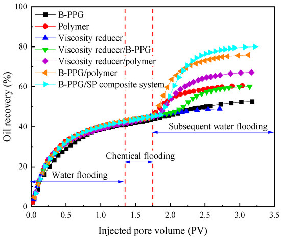 According to Table 1 and Figure 5, the water flooding recovery of all experiments was at the same level, while the incremental oil recovery varied due to the injection of different chemicals. The B-PPG/SP composite system had the best ability to enhance heavy-oil recovery. By injecting 0.4 PV B-PPG/SP composite into the system, the heavy-oil recovery increased from 42.2% to 80.0% with increments of 37.8%. The synergistic effect between viscosity reducer, B-PPG, and polymers effectively enhanced heavy-oil recovery.