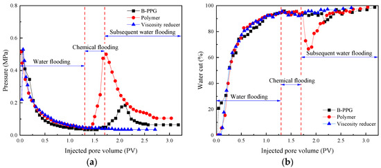 According to Figure 6, after water flooding, the pressure increase in polymer flooding was at its largest, while the viscosity reducer flooding was almost negligible. Meanwhile, compared to polymer flooding, the pressure increase and water cut decrease in B-PPG flooding lagged behind. Analysis suggested that both polymer flooding and B-PPG flooding enhanced heavy-oil recovery by expanding the swept area, which led to an increase in displacement pressure after water flooding. However, the mechanisms by which polymer flooding and B-PPG flooding improved the swept area were different. Polymers directly increased the viscosity of the water phase, increasing the flow resistance and expanding the swept area. B-PPG utilized its unique “partially crosslinked and partially branched” molecular structure to dynamically adjust and block the flow line in porous media through viscosity enhancement and elastic deformation properties, thereby expanding the swept area. The effect of polymer flooding on enhancing heavy-oil recovery was more significant due to B-PPG. In viscosity reducer flooding, most viscosity reducer flowed out along the advantageous channels formed after water flooding, failing to effectively emulsify heavy oil and reduce heavy-oil viscosity, resulting in a limited ability to enhance heavy-oil recovery.