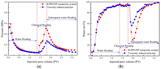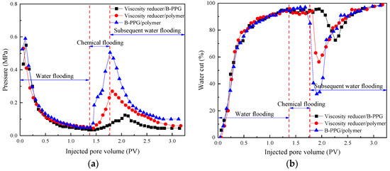 According to Figure 6 and Figure 7, by comparing viscosity reducer/B-PPG flooding and B-PPG flooding, the synergistic effect of viscosity reducer and B-PPG resulted in a decrease in the pressure of viscosity reducer/B-PPG flooding compared to B-PPG flooding after water flooding, while the heavy-oil recovery increased. B-PPG increased the contact between viscosity reducers and heavy oil by expanding the swept area. During the flow process, viscosity reducers can effectively emulsify heavy oil to form O/W emulsion, thereby reducing the flow resistance and enhancing heavy-oil recovery. The synergistic effect between viscosity reducers and polymers is similar to the synergistic effect between viscosity reducers and B-PPG. However, emulsions containing polymers have better stability, as shown in Figure 4.