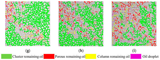 Remaining oil distribution at the end of different chemical flooding periods. (a) Initial state; (b) water flooding; (c) B-PPG/SP composite flooding; (d) B-PPG flooding; (e) polymer flooding; (f) viscosity reducer flooding; (g) viscosity reducer/B-PPG flooding; (h) viscosity reducer/polymer flooding; (i) B-PPG/polymer flooding.