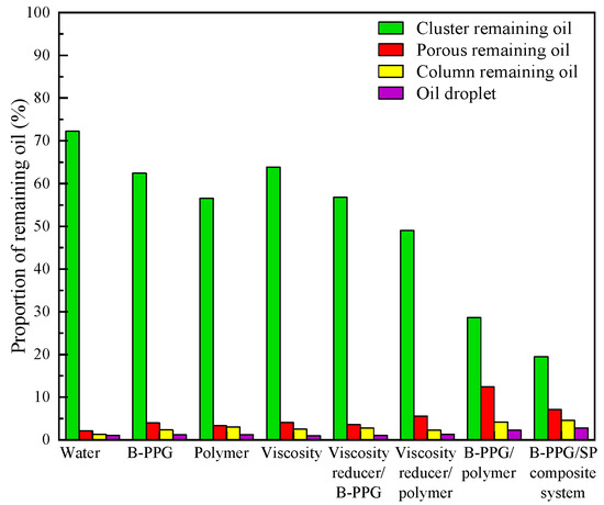 From Table 2 and Figure 10, due to the high viscosity of heavy oil, the water flooding recovery was low and the proportion of clusters of remaining oil was the highest. According to Figure 11, B-PPG/polymer flooding and B-PPG/SP composite flooding can effectively displace cluster remaining oil and increase the oil recovery. Therefore, for low-recovery heavy-oil reservoirs, expanding the swept area to displace cluster remaining oil is the most effective method of enhancing heavy-oil recovery. However, by increasing the swept area and utilizing the cluster remaining oil, some of the cluster remaining oil will transform into dispersed remaining oil, such as column remaining oil and oil droplets. Therefore, in order to further enhance heavy-oil recovery, it is necessary to consider utilizing the dispersed remaining oil.