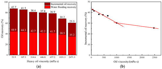 Comparison of oil recovery of B-PPG/SP composite system flooding experiments with different heavy oil viscosities. (a) Recovery and increment oil recovery of B-PPG/SP flooding experiments oil with different oil viscosities; (b) Relationship between incremental oil recovery and oil viscosity of B-PPG/SP flooding experiment.