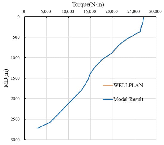 The example well has a total length of 2715 m, with the surface casing set at 367 m. The casing friction coefficient is 0.25, and the open-hole friction coefficient is 0.3. The drilling fluid density is 1.16 g/cm3, the bottomhole torque is 3000 N m, and the weight on bit (WOB) is 30 kN. Figure 3 compares the torque model calculation results with those obtained from WELLPLAN, focusing on the torque distribution along the well depth and the prediction accuracy at critical points. The results indicate strong agreement between the model predictions and the software calculations, with an error of 1.5% in the cased section, an error of 1.8% in the open-hole section, and an average deviation of less than 2% for the entire well. Thus, the model’s accuracy meets the requirements of actual drilling operations.