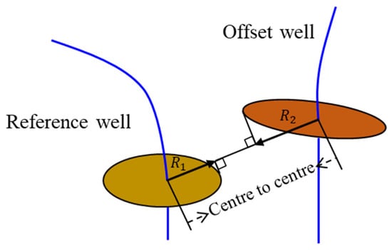 where SF is the separation factor. CC is the distance between the reference well and offset well, m, and R1 and R2 are the ellipsoid axis lengths of the reference well and offset well, m.