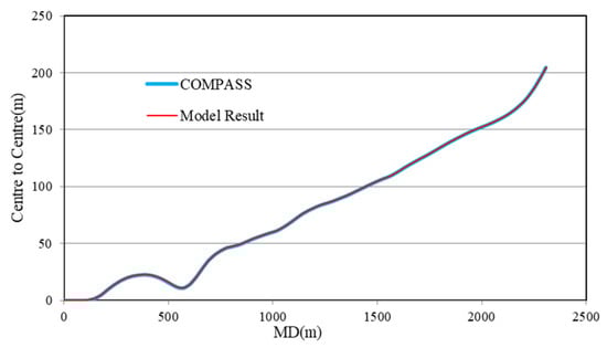 As shown in the figure, the reference well is a sidetrack well with a trajectory direction similar to that of the offset well, necessitating high anti-collision precision. The reference well has a total length of 2308.0 m, while the offset well is 2471.9 m long. The gravitational acceleration is set to 9.8 m/s2, the magnetic inclination is 57.2°, the declination is −6.6°, and the magnetic field strength is 53,659.1 nT. A standard MWD tool is used for survey measurements, and 32 error sources are considered. Figure 6 shows the variation in wellbore separation distance with MD. The results show that after the sidetracked wellbore is drilled, the minimum wellbore separation distance of 11.1 m occurs at a MD of 570 m. Compared to COMPASS, the scanning deviation of the wellbore separation distance is less than 0.01%.