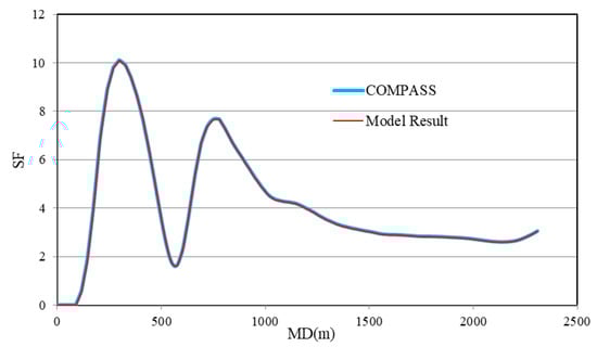 Figure 7 presents the relationship between MD and the SF. The results indicate that the minimum SF also occurs at a MD of 570 m, with a value of 1.61, which is close to the safety threshold of 1.5. Given its proximity to the threshold, this wellbore section requires special attention for collision risk mitigation. Additionally, the deviation between the model and COMPASS calculations remains within 0.5% across the entire wellbore, demonstrating the high accuracy and reliability of the proposed anti-collision model.