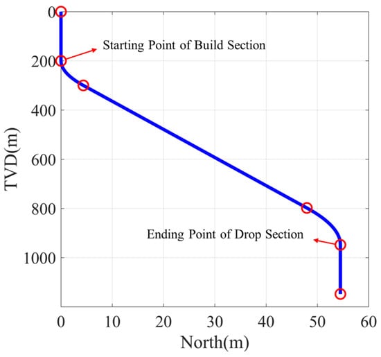 Figure 8 shows the vertical projection of a well with PACTA. An adjustment section is added before the kickoff point (KOP), and it consists of five parts: the first vertical section, the build section, the hold section, the drop section, and the second vertical section. In the adjustment, upon reaching the designated depth, the trajectory builds up to a 5° inclination, holds for a section, and then drops back to vertical.