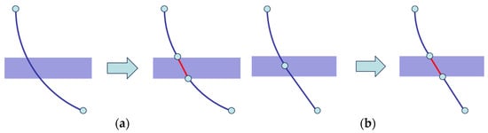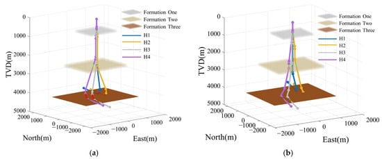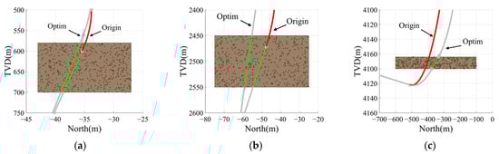 The proposed method involves two-round optimization processes, with different handling of formation constraints in each phase. During the first-round optimization, the goal is to avoid the following scenarios: (1) the build and turn section intersects restricted formations; (2) the entire build section is within a restricted formation. Figure 9 illustrates the handling of build sections crossing restricted formations during the second-round optimization phase. Figure 9a shows that when the build section entirely overlaps with the restricted formation, the section is split into a build–hold–build section. Figure 9b demonstrates that when the build section partially overlaps with the restricted formation, the section is adjusted into build–hold or hold–build section.
