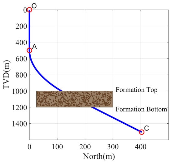For example, in section AC of Figure 1, if the coordinates of points A and C are known, the number of unknown DLS variables satisfies some rules. When the constrained formation exactly spans point B as shown in Figure 10, according to the splitting method shown in Figure 9b, the section from point C to the top of the formation is a hold section. Since the depth of the restricted formation is fixed, the DLS of the arc between points A and the top of the formation can be calculated. Notably, when a restricted formation crosses the build section AB, additional unknown DLS variables are introduced. For each additional restricted formation, one more unknown DLS variable is added.
