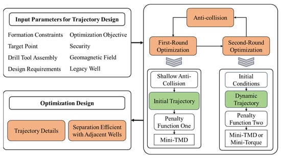 Figure 11 shows the trajectory optimization framework. After importing the design parameters, first-round optimization is carried out with the objective of minimizing total measured depth (TMD), yielding the initial trajectory. Penalty Function One includes both logical and conditional penalties. This optimization involves seven unknown variables: the TVD of the KOP, the inclination and azimuth angles of the hold section, the inclination angle at the end of the build and turn section, and the DLS of the two build sections and the build and turn section. If PACTA is applied, four additional unknown variables are introduced: the TVD of the proactive anti-collision build-up start point, the TVD of the drop-off completion point, and the DLS values for the build-up and drop-off sections.