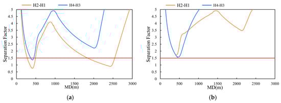 To validate the effectiveness of PACTA and anti-collision constraints, Figure 15 shows the change in the SF before and after the addition of the proactive anti-collision adjustments. As shown in the figure, without the constraints, there are two regions between well H2 and well H1 where the SF is less than 1.0, located at approximately 500 m and 2500 m measured depth of well H2. After adding PACTA, well H2 starts building inclination before 500 m MD, increasing the wellbore spacing with the upper well section of well H1, resulting in a SF exceeding 1.5 at 500 m. Additionally, the trajectory anti-collision constraint optimizes the wellbore trajectory by adjusting the initial build direction, which increases the SF at 2500 m to over 3.5.