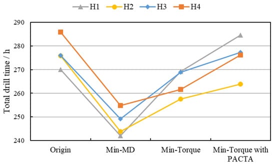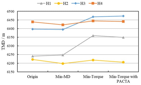 Figure 18 compares the total torque of the original and optimized designs. Total torque values for all three optimization approaches were significantly reduced. The minimum torque optimization achieved the lowest torque, with an average reduction of 19.7%. When considering drillstring and equipment failure risks, torque constraints should be included. Additionally, in cases of closely spaced surface locations, incorporating PACTA reduces drilling risks.