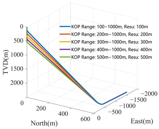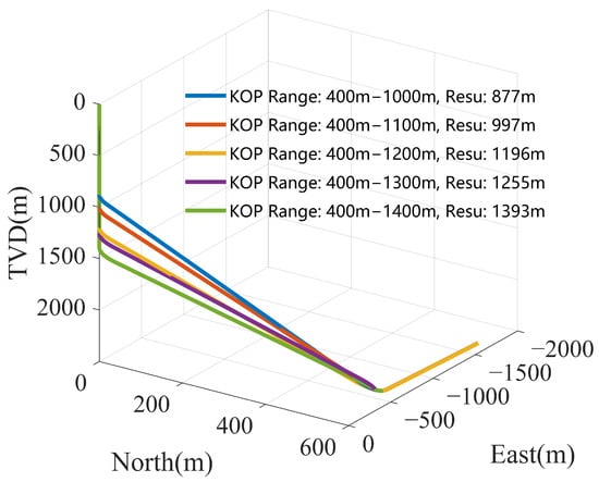 For conventional optimization methods, without considering the influence of formation fitness of building a curve, the KOP serves as a critical optimization variable and exhibits certain patterns. Based on previous research, this study further investigates the impact of different optimization conditions on the selection of the KOP location. Figure 19 and Figure 20 show the variation in the KOP position under different constraint ranges for the minimum TMD and minimum torque conditions. It can be observed that when the optimization objective is the minimum TMD, the KOP tends to be the shallowest within the allowed range; when minimizing torque, the KOP tends to approach the lower limit of the allowable range.
