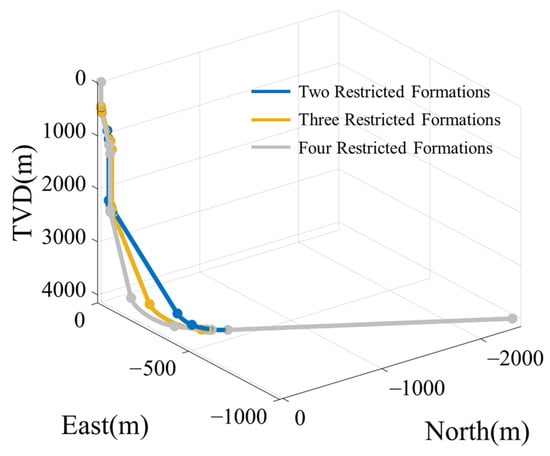 The optimization results discussed above incorporate three restricted formations. Restricted Formation One, located at a TVD of 580–700 m, constrains the positioning of PACTA. Restricted Formation Two, situated at a TVD of 2450–2550 m, primarily limits the length of the hold section. Restricted Formation Three, located at a TVD of 4132–4140 m, divides the second build section. The optimization time per well was approximately 3 min.
