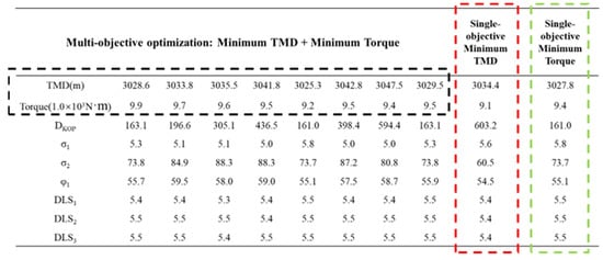 Figure 23 compares the results of single-objective and multi-objective optimization for minimizing torque and well depth. The results indicate that when the minimum torque mode is applied, the trajectory parameters corresponding to the lowest torque can be obtained. Similarly, under the minimum TMD mode, the trajectory parameters with the minimum well depth are achieved, with the objective values being lower than those in multi-objective optimization. This occurs because, in single-objective optimization, fewer parameters are considered, often leading the model to adopt extreme control strategies that push parameters toward constraint boundaries, resulting in overly idealized outputs that are difficult to implement in actual drilling operations.