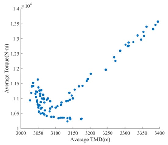 The parameter values from the iterative process of multi-objective optimization are output in the form of a Pareto front, as shown in Figure 24. The figure demonstrates that during the iterative process of multi-objective optimization, the average TMD and average torque in each iteration continuously decrease. When the Pareto front boundary is reached, the diversity of the solution set significantly increases. At this stage, the multi-objective function can no longer be minimized and gradually converges toward the single-objective minimum results, exhibiting a divergence phenomenon.