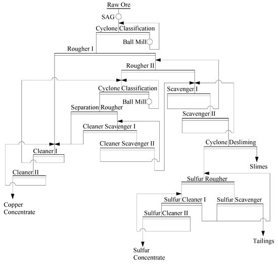 The beneficiation plant operates with two parallel circuits (line I and line II), both following a copper-first and sulfur-later sequence (see Figure 1). The copper concentrate circuit involves two rougher stages, two scavenger stages, one separation–rougher stage, two cleaning–scavenger stages, and two cleaner stages. Copper tailings undergo desliming process and are subsequently processed through one rougher stage, one scavenger stage, and two cleaner stages to produce sulfur concentrate.