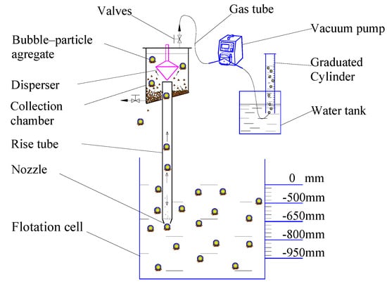 This study utilizes an innovative bubble load measurement apparatus comprising a riser tube, collection chamber, gas conduit, and measurement cylinder (see Figure 2). Distinct from Seaman’s design [7], the new apparatus employs an equilibrium-based principle. The vacuum pump evacuates gas from the collection chamber while implementing real-time suction volume modulation to maintain a stable gas–liquid interface, thereby reducing particle entrainment and sampling volume insufficiency induced by fluid flow dynamics.