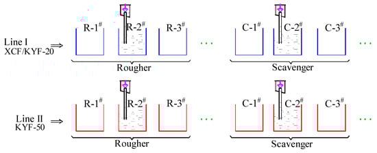 Froth flotation processes typically comprise three sequential stages: rougher, cleaner, and scavenger stages. The rougher stage achieves rapid recovery of the majority of valuable minerals, whereas the scavenger stage targets residual valuables in rougher tailings. The combined efficiency of these two stages fundamentally determines the overall mineral recovery in beneficiation processes. This comparative study was implemented in two parallel flotation circuits (line I and line II) within the same concentrator plant, operating under deliberately matched process flowsheets and reagent regimes. Line I utilizes eight XCF/KYF-20 flotation cells (Designed and manufactured by BGRIMM-MAT, Beijing, China) for sulfur rougher and scavenger operations at 2000 t·d−1 throughput, while line II employs nine KYF-50 flotation cells (Designed and manufactured by BGRIMM-MAT, Beijing, China) for the equivalent processing stages, achieving 5000 t·d−1 capacity.