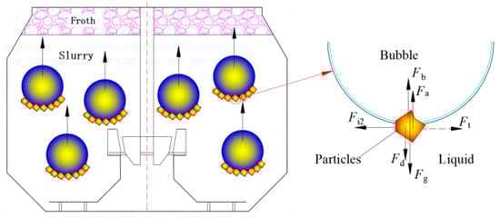 The ascent dynamics of particle–bubble aggregates (PBAs, mineralized bubbles) involve complex force interactions that collectively determine bubble–particle stability. Buoyancy force drives PBA ascent through the pulp phase, counteracted by gravitational settling and viscous drag forces. Interfacial adhesive forces enhance particle attachment to bubble surfaces, in contrast to destabilizing inertial/turbulent forces that may compromise PBAs’ structural integrity [26]. The quantitative force balance governing mineralized bubble trajectories is systematically analyzed in Figure 4 with vector resolution diagrams. Precise optimization of these competing force interactions constitutes a critical control parameter for flotation process intensification.