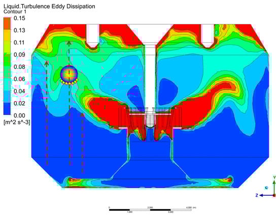 Analysis of the Bo* formulation indicates that the turbulent kinetic energy dissipation rate (ε, m2·s−3) dominantly controls attachment stability. Consequently, flow-field simulations effectively map the spatial distribution of turbulent regimes within flotation cells. Figure 5 demonstrates heterogeneous ε distribution zones in the cell interior. Ascending mineralized bubbles traverse alternating high ε and low ε regions, thereby dynamically influencing their stability.