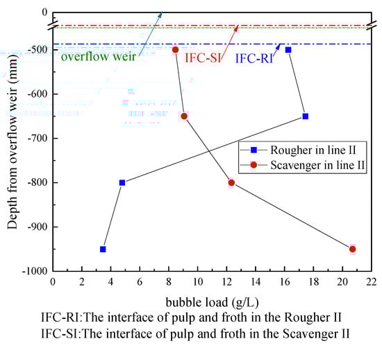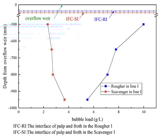 Figure 6 quantifies the bubble load characteristics of the rougher flotation cell (R-2#) within the line I processing circuit. The bubble load demonstrates a gradual upward trend with ascending sampling positions, peaking at 10 g/L in the uppermost position (h = −500 mm relative to overflow weir). Conversely, the scavenger flotation cell (C-2#) exhibits an inverse hydrodynamic behavior: the bubble load systematically decreases as sampling positions rise. The uppermost position in the scavenger cell registers a bubble load of 2.33 g/L, with minimal variations observed across all sampling points.